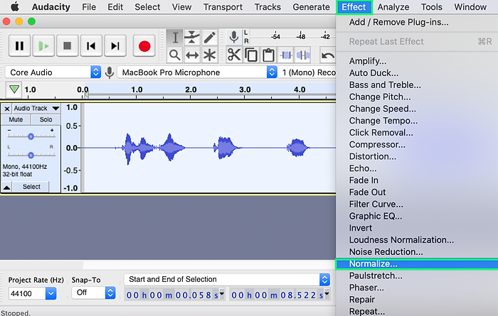 Highlight the section of audio you want to normalize, or select Control+A to select an entire audio track.